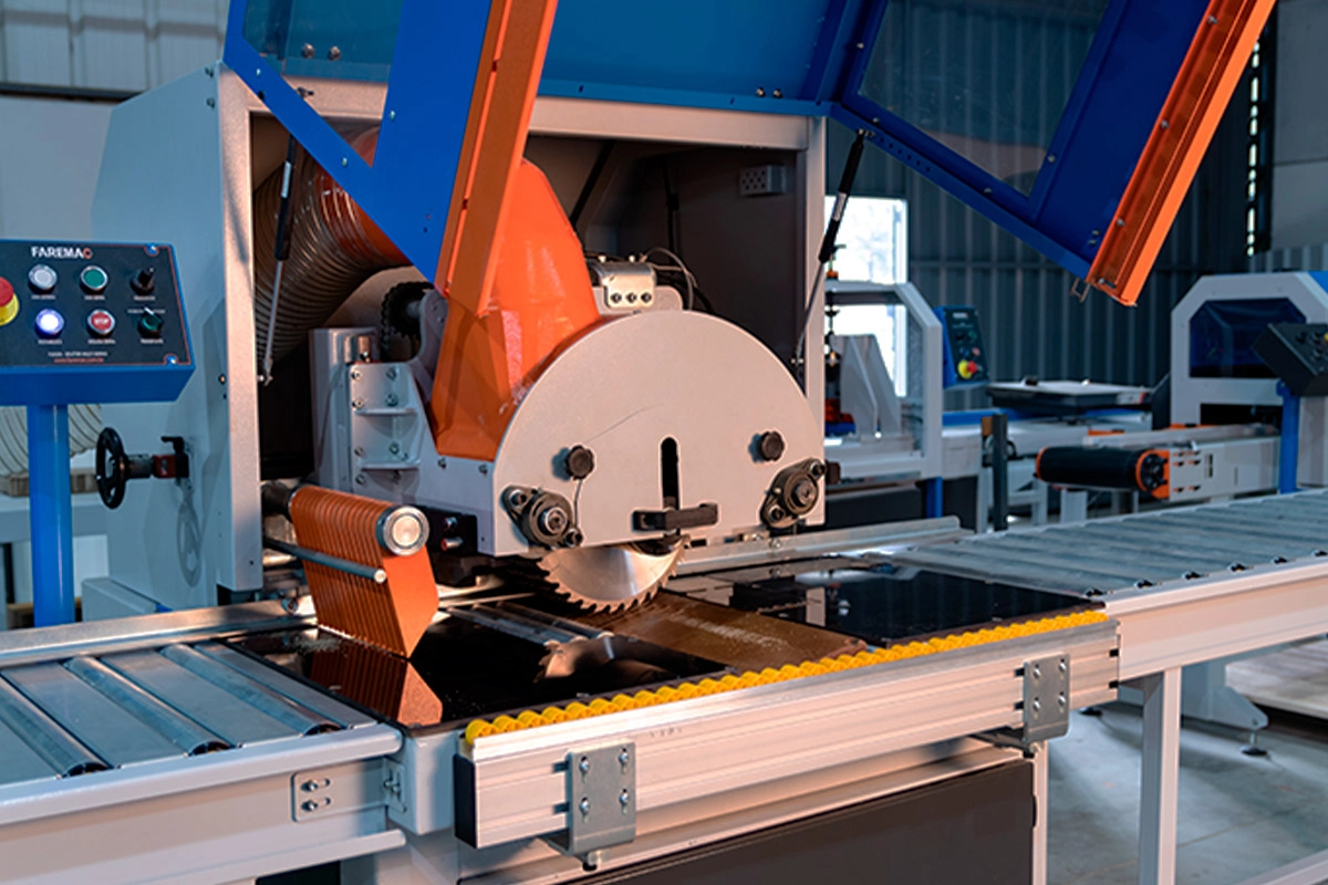 As Serras Especiais Faremac são máquinas de corte com cabeçote multiserras, projetadas para sarrafos de MDF, MDP e aglomerado com larguras específicas.